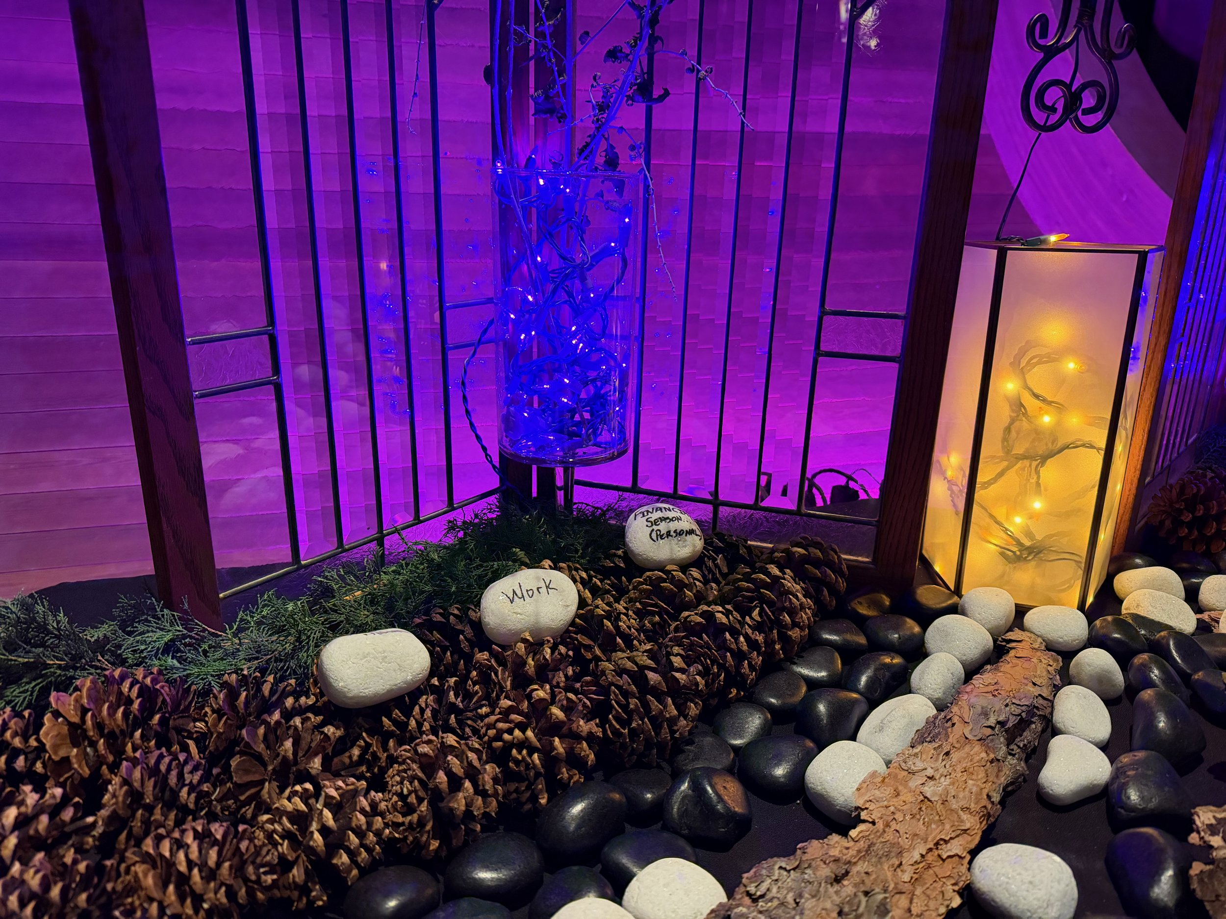 Designed to be accessed 24/7, it included natural elements such as stone, bark, juniper, sage, and pine cones along with icons, thematic elements, and integrated lighting.