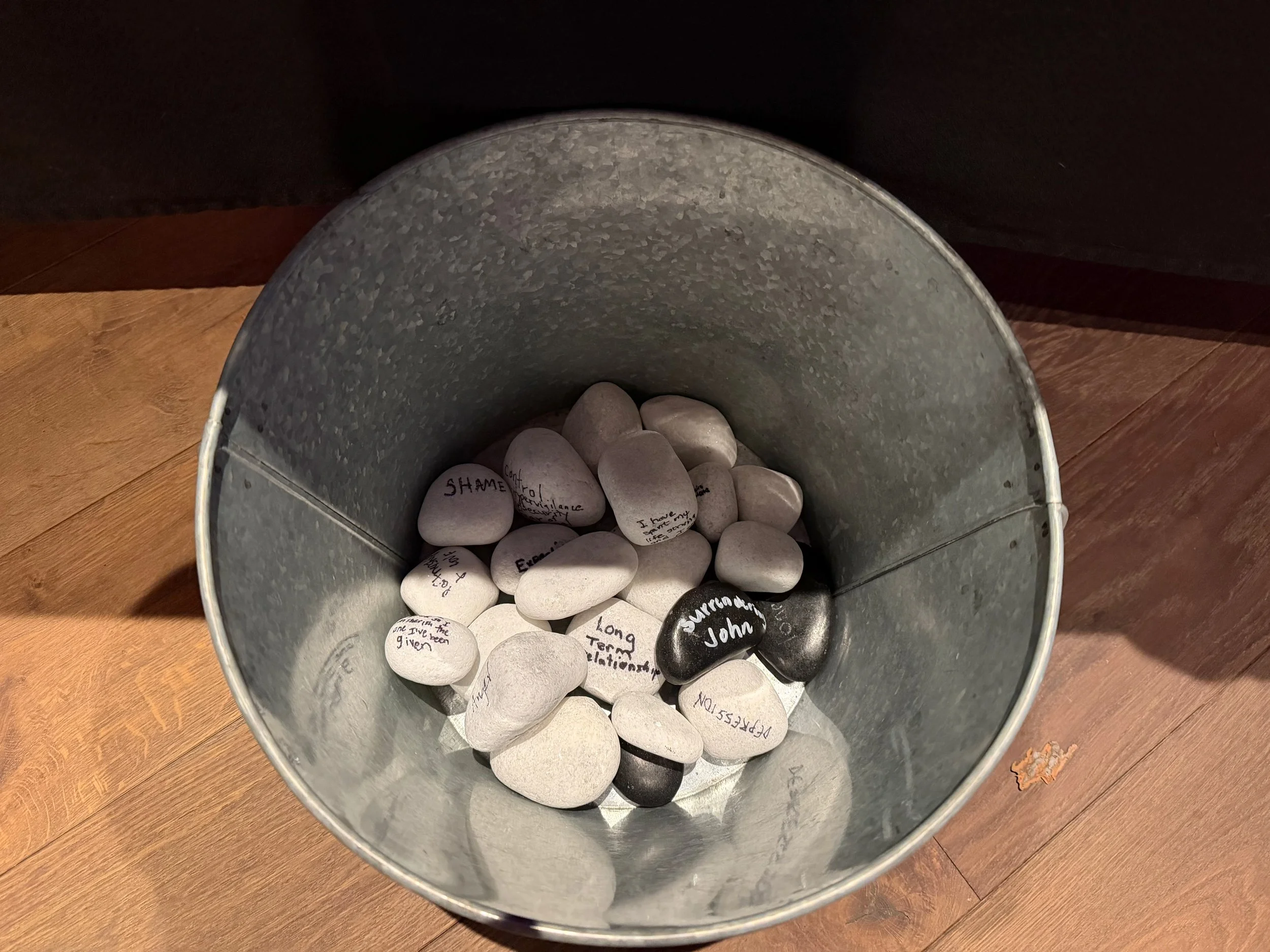 I designed a release altar for a nonprofit organization’s retreat setting that invited participants to let go of or surrender whatever might keep them from being fully present at the retreat and/or whatever they might be prompted to surrender as a result of their inner work there.